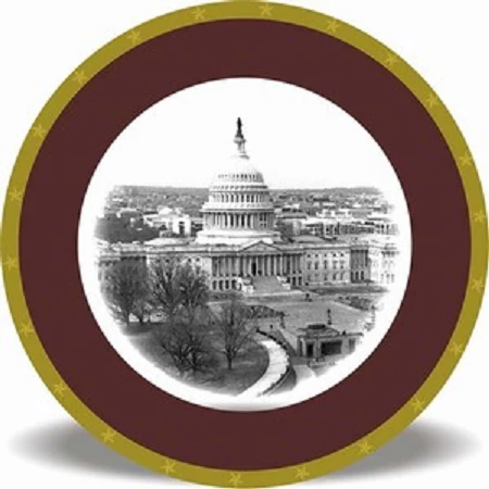 East Front Dessert Plate: Inspired by the architectural designs in the rotunda ceiling, It has border of maroon and gold stars. It has an image of the newly renovated east front entrance to the U.S. Capitol building. East Front Dessert Plats is 7 1/2”.