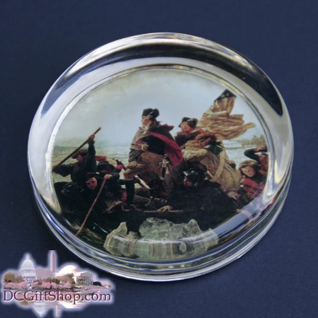 On the day after Christmas in 1776, General George Washington resolutely led American revolutionary troops across the Delaware River, the first move in a surprising attack against the English and Hessian troops in the Battle of Trenton. Confidently, the General inspired his soldiers as they struggled against great odds to cross the icy river at dawn.