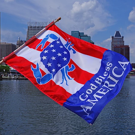 You will love our patriotic God Bless America crab garden flag. The flag features an Atlantic Blue Crab with 13 stars representing the 13 founding colonies of the United States. The flag also has the words, “God Bless America!” Blue crabs are a culinary favorite up and down the East Coast. A popular mnemonic (memory device) to differentiate gender of blue crabs. the male’s apron (underside flap) is shaped like the Washington Monument, while the mature female’s resembles the dome of the United States Capitol.