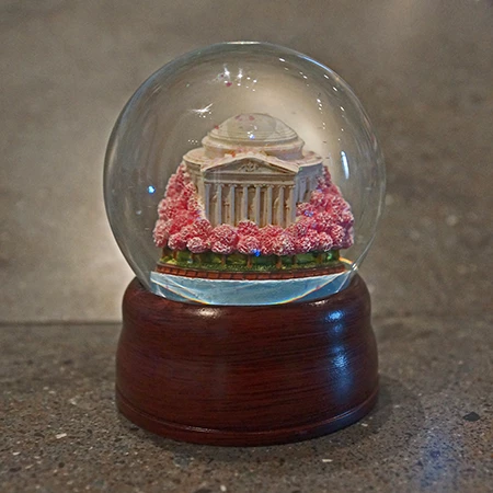 This glass snow globe with a hardwood base will look great at your home or office. The snow globe depicts a Springtime scene of cherry blossom trees blooming around the Thomas Jefferson Memorial. Give the globe a gentle shake and watch the petals flurry.
