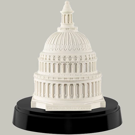 Marble replica of the dome of the United States Capitol. Capitol dome is made from the marble of the actual east front steps that were taken during renovation. The marble steps have been ground to a fine powder and molded into a decorative desk or shelf accessory. Boxed with provenance information on base. Made in America. Limited quantities available