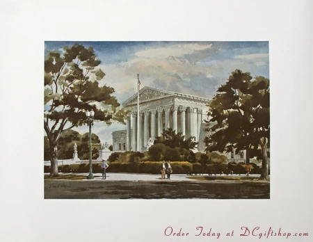 This reproduction watercolor print by the famous painter Paul Norton features the outside front of the United States Supreme Court Building in Washington, DC. You can own a watercolor print of the building where the most powerful judicial system in the world makes decisions which have an effect on almost every American.